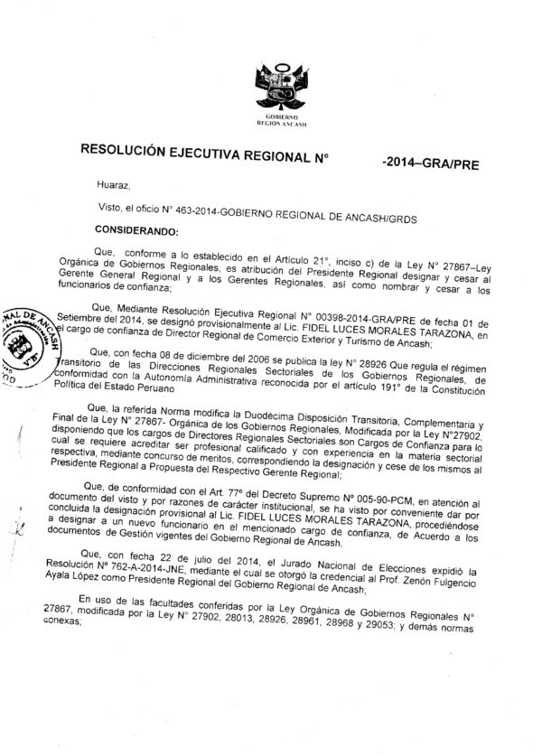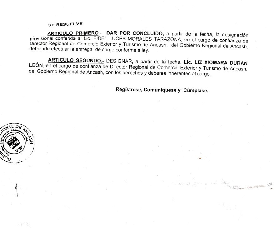 El Comercio accedió a la Resolución Ejecutiva Regional 513, firmada por Ayala el 22 de setiembre, que nombra a Jacinto Durán Cotillo, padre de Ángel Durán, representante de la Dirección de Educación de Áncash ante el directorio de la Sociedad de la Beneficencia de Huaraz. Un cargo de confianza.