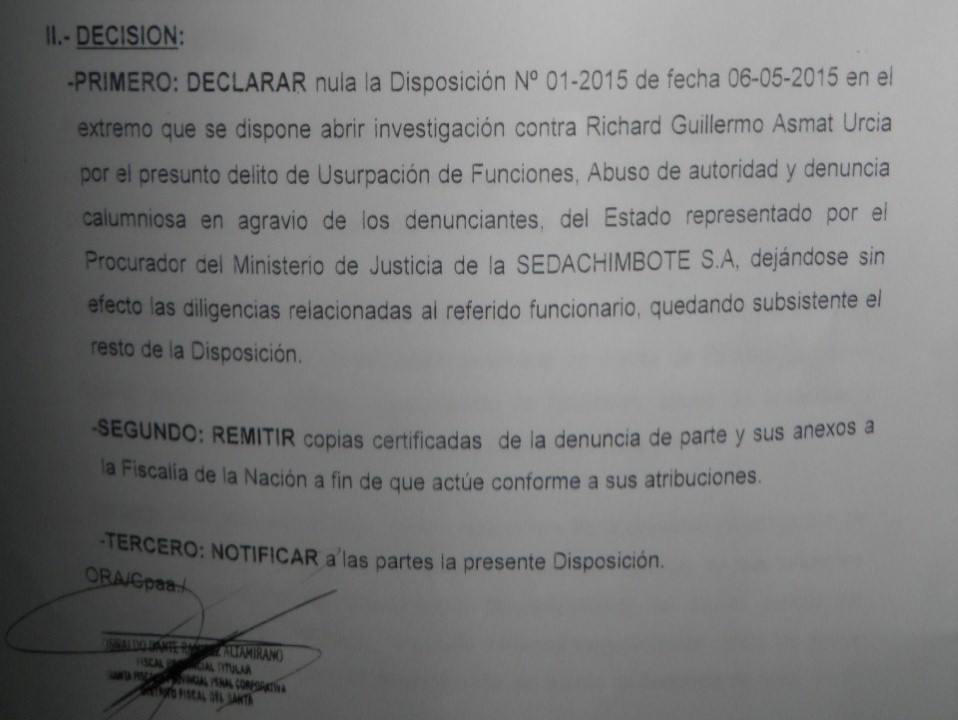 Tal como se informó fueron los fiscales Carmen Arana Álvarez y Oswaldo Ramírez Altamirano quienes tomaron la decisión de abrir investigación contra el procurador por el presunto delito de abuso de autoridad y denuncia calumniosa, luego que este solicitara que se investigue a los integrantes de la Junta de Accionistas de Sedachimbote que incluye a los alcaldes de Nuevo Chimbote, Casma y Huarmey por el nombramiento indebido del cargo del exgerente general, Manuel Rodríguez Senmanche y la directora, en representación de la comuna provincial, Rosa María Bartra Barriga.