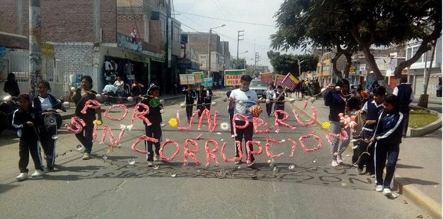 Por otro lado, escolares del Puerto Casma marcharon con los brazos cruzados y exhibieron ante las autoridades y pobladores una banderola hecha con red de bolichera que llevaba el lema: “Por un Perú sin corrupción”.