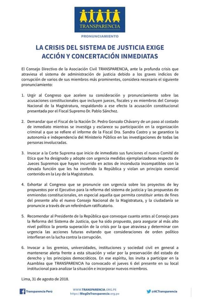 Este pedido se dio a conocer a través de un  comunicado en el que Transparencia demanda también que se garantice la autonomía e independencia del Ministerio Público en las investigaciones de todas las personas involucradas en este caso.