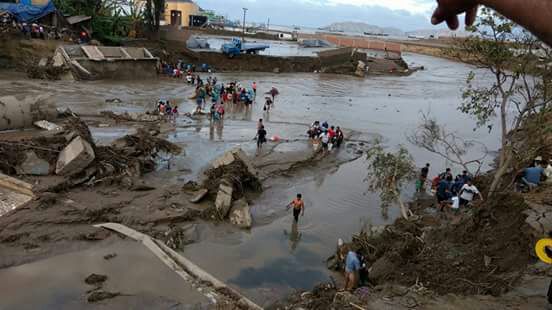 Chimbote en Línea. – La carretera de acceso al campo santo de Coishco fue destruida, por ese motivo un grupo de pobladores cruzó el huaico cargando un féretro, a la altura del destruido kilómetro 439 de la carretera Panamericana Norte.