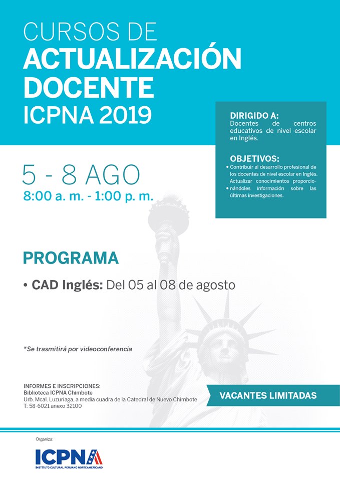 Chimbote en Línea.- Con la finalidad de afianzar su compromiso con la difusión de la cultura y el fomento de la educación peruana, el ICPNA realizará, de manera gratuita, los Cursos de Actualización Docente (CAD) ICPNA 2019.