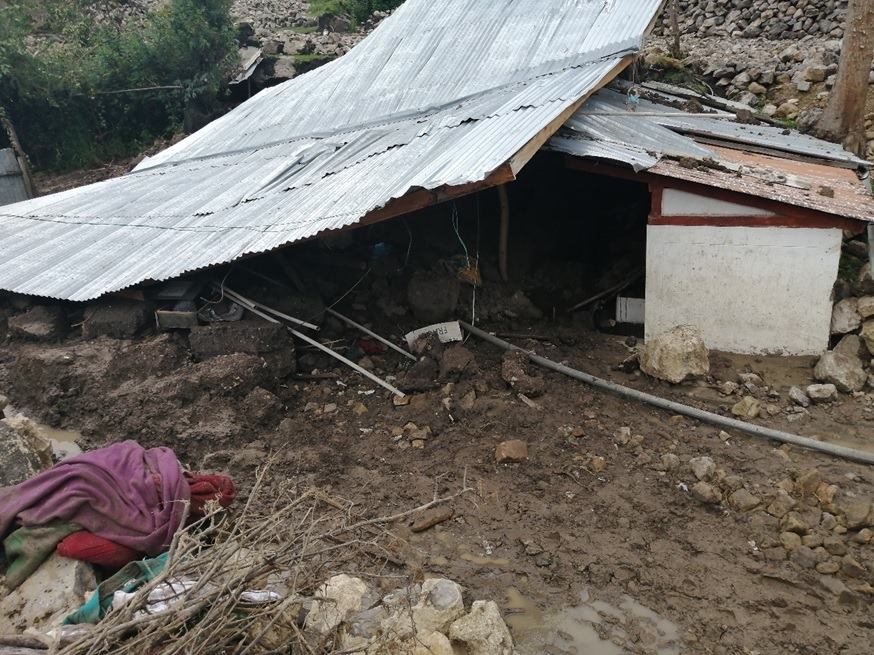 También dos viviendas de material rústico (tapial) colapsaron por el ingreso de lodo y piedras. Son tres las familias damnificadas, las cuales fueron instaladas temporalmente en un local comunal de la municipalidad distrital y en casa de sus familiares. También otras 8 viviendas de material rústico quedaron afectadas.