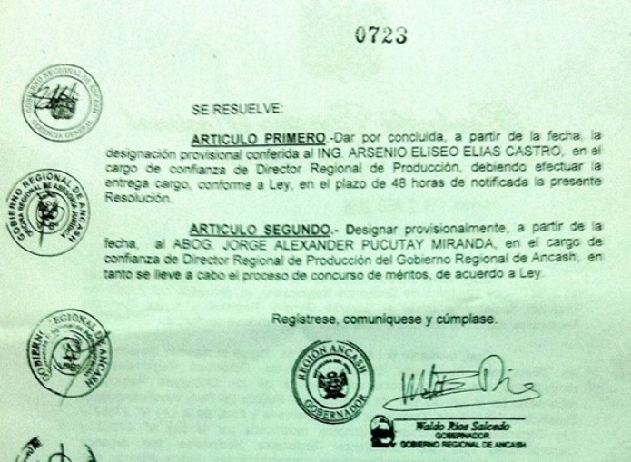 Chimbote en Línea.- Con Resolución Ejecutiva Regional Nº 0723-2015-GRA/GR de fecha 12 de agosto, fue designado como titular de la Director Regional de la Producción (Direpro) , el abogado chimbotano Jorge Pucutay Miranda, quien desde mañana asumirá formalmente el cargo en esta sede del Gobierno de Áncash.
