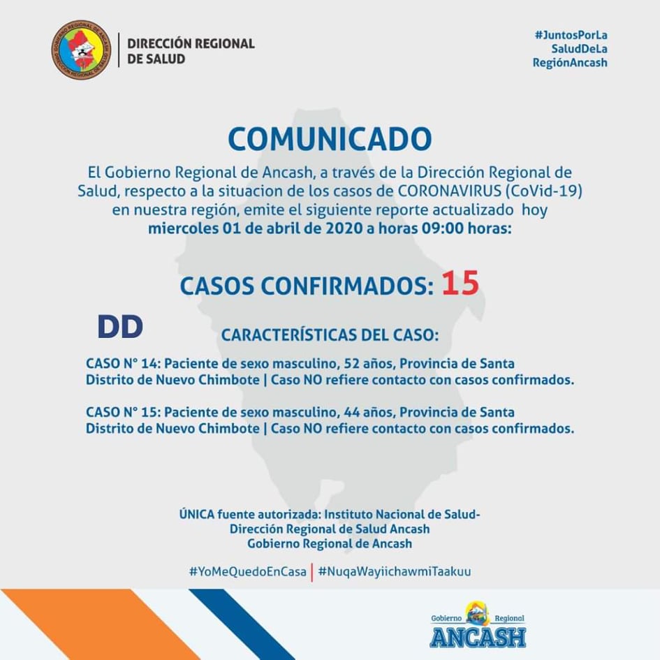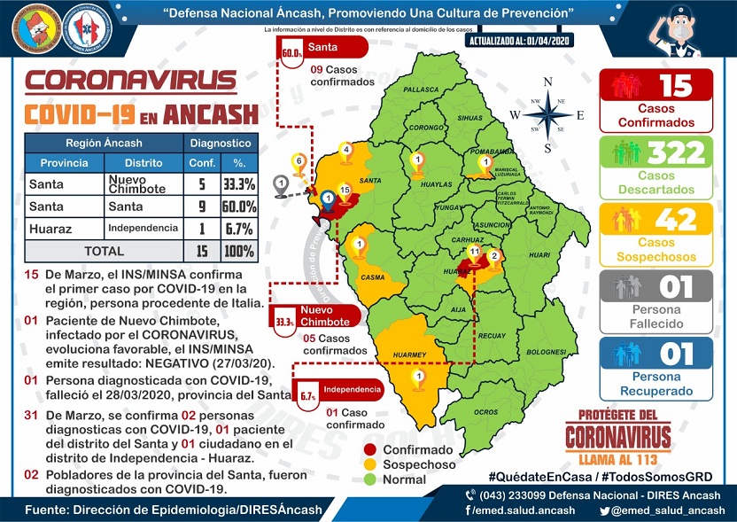 Los últimos dos casos han sido reportados en el distrito de Nuevo Chimbote, ubicado en la provincia del Santa. Se trata de un varón de 52 años y una mujer de 44 años. Ambos refieren no haber tenido contacto con personas contagiadas ni del extranjero, por lo que se cree que se tratan de casos comunitarios en Áncash.