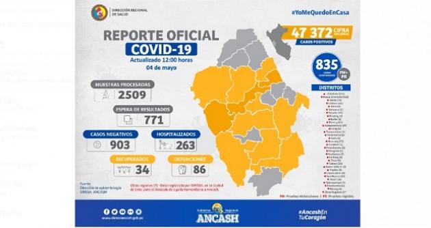 Chimbote en Línea. – En lo que va de la emergencia sanitaria el coronavirus ha causado la muerte de 86 personas en la región Áncash, donde además se han confirmado 835 casos, entre pruebas rápidas y moleculares.