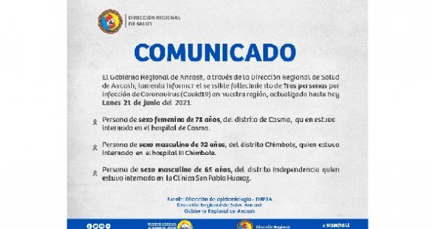 Chimbote en Línea. – La Dirección Regional de Salud de Áncash (DIRESA) reportó tres fallecidos por la Covid-19 en esta región, la cifra más baja desde que inició la Segunda Ola, en enero.