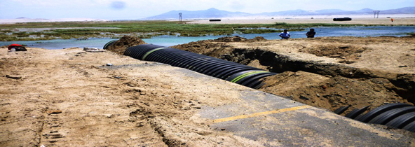 El avance desmedido de las filtraciones producto del riego indiscriminado de los posesionarios informales del Proyecto Especial Chinecas ha provocado la ruptura de una tramo de la Carretera Panamericana Norte (CPN), a pocos metros del Peaje de Vesique, para desembocar el agua filtrada, a un costado de la vía.(Texto y foto Cintia Cabrera)