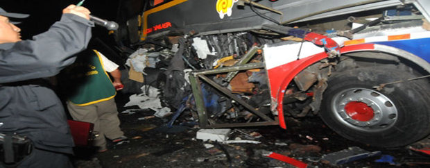 Foto: La IndustriaChimbotenlinea.com (Con datos de La Industria) En las primeras horas de hoy se confirmó la muerte de 5 de los 60 pasajeros que viajaban de Lima a Trujillo, en el bus de la empresa de transportes Costeño; que chocó con la parte trasera de un cargador frontal y fue impactado por un segundo vehiculo pesado; a la altura del kilómetro 408 de la Panamericana Norte, cerca a Huambacho (Samanco) . El hecho ocurrió anoche al promediar las 7.40 p.m.; registraándose además unas 20 personas heridas, las que fueron trasladadas al Hospital Regional "Elezar Guzman Barrón" de Nuevo Chimbote.