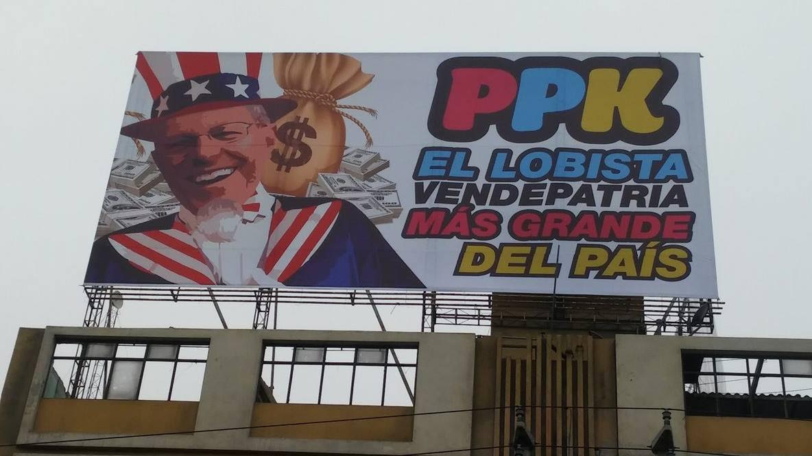 En el panel ubicado en lo alto de un conocido edificio de esta calle se lee la frase “PPK, el lobista vendepatria más grande del país” y una foto donde el candidato viste un traje simbólico de Estados Unidos. Cabe destacar que en este mismo edificio operaba el local de campaña de la excandidata al Congreso y ahora virtual congresista fujimorista, Yesenia Ponce.