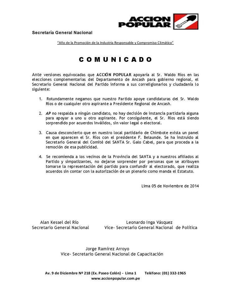 Chimbote en Línea.- El secretario general del Comité Ejecutivo Departamental de Áncash de Acción Popular, Gustavo De la Cruz Dueñas, informó a la prensa de Huaráz respecto al comunicado emitido por la Secretaría General Nacional del Partido, en el cual se niega que se éste apoyando la candidatura de Waldo Rios.