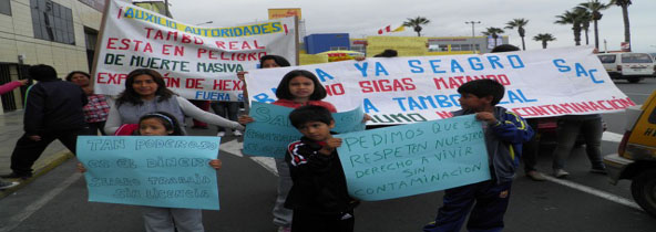 Chimbotenlinea.com (Por: Lindberg Cruzado).- Con carteles y pancartas en mano y lanzando arengas, medio centenar de vecinos de Tamborreal, llegaron esta mañana a Chimbote para efectuar una marcha de protesta en contra del funcionamiento de la empresa Seagro SAC, procesadora de marigold, porque presuntamente viene contaminando a la población.