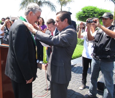 Posteriormente, la autoridad edil entregó la medalla de la ciudad a la Asociación de Jubilados de Nuevo Chimbote -en la persona de su presidente, César Guerra Álamo- y agradeció a ésta por preservar el terreno de 1.5 hectáreas donde se edificará el nuevo nosocomio sureño.