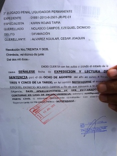 Chimbotenlinea.com (Por: Cintia Cabrera).- El próximo 8 de Agosto se leerá la sentencia por el delito de Difamación en contra del ex consejero regional Ezequiel Nolasco Campos, quien desde ya advierte que dicho proceso puede estar dirigido ya que la jueza Edith Arroyo Amoroto encargada de este dictamen es prima del alcalde provincial Luis Arroyo Rojas.(Foto Cintia Cabrera)
