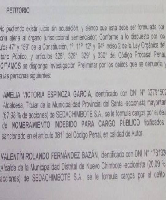 La denuncia alcanza también a los integrantes de la Junta de Accionistas de la empresa del agua, entre ellos el alcalde del distrito de Nuevo Chimbote, Valentín Fernández Bazán; el de la Municipalidad de Casma, Jhosept Pérez Mimbela y el alcalde de la Municipalidad Provincial de Huarmey, Miguel Sotelo Llacas. A todos ellos por haber aceptado tales designaciones de manera indebida.