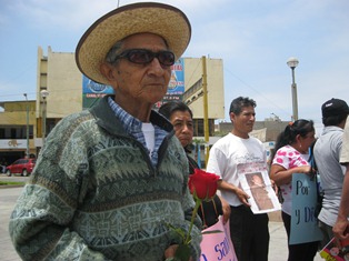 Noriega Cardoso llevaba una rosa roja en la mano durante su protesta, dijo que es un símbolo de la sangre derramada por su hijo, cuyo cadáver y de los otros ocho campesinos santeños fueron hallados después de 19 años en agosto del 2011, en una zona descampada de Huaca Corral, en el distrito de Guadalupito (La Libertad).