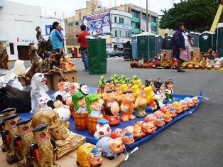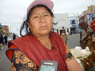 Encontramos a la señora Georgina Samanez (57), una arequipeña que viene todos los años a Chimbote para vender artesanías elaboradas con yeso. Ella nos cuenta que ha dejado en su tierra a sus 5 hijos, con la finalidad de trabajar y no les falte su comida. Dijo que para estar en este pequeño espacio le han cobrando 50 soles.
