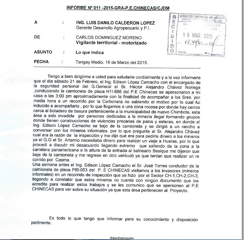 También aseguró que de acuerdo al informe N° 058-2015 de la Gerencia de Desarrollo Agropecuario y Promoción de la Inversión se certifica las constantes inspecciones que realizan los funcionarios de Chinecas y representantes del Ministerio Público para tratar de contrarrestar las invasiones de las tierras de Chinecas.