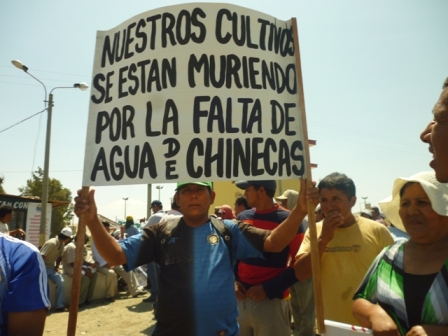 Chimbotenlinea.com (Por: Cintia Cabrera).- Cientos de agricultores de la Junta de Usuarios de Nepeña y la Comisión de Regantes protestaron frente al local del Proyecto Especial Chinecas exigiendo más cantidad de agua para el riego de sus cultivos. Los campesinos culparon a los agricultores invasores de La Carbonera de apropiarse del agua y disminuir la ración que les corresponde a ellos.En reunión con el gerente del directorio de Chinecas, Elvis Camarena, el presidente de la Comisión de Regantes Huambacho - El Arenal, Francisco Sánchez Díaz, exigió que se aumenten las horas de riego, ya que desde hace tres años sólo disponen de 800 litros de agua por día cuando lo necesario es de 2.500 litros de agua diario.