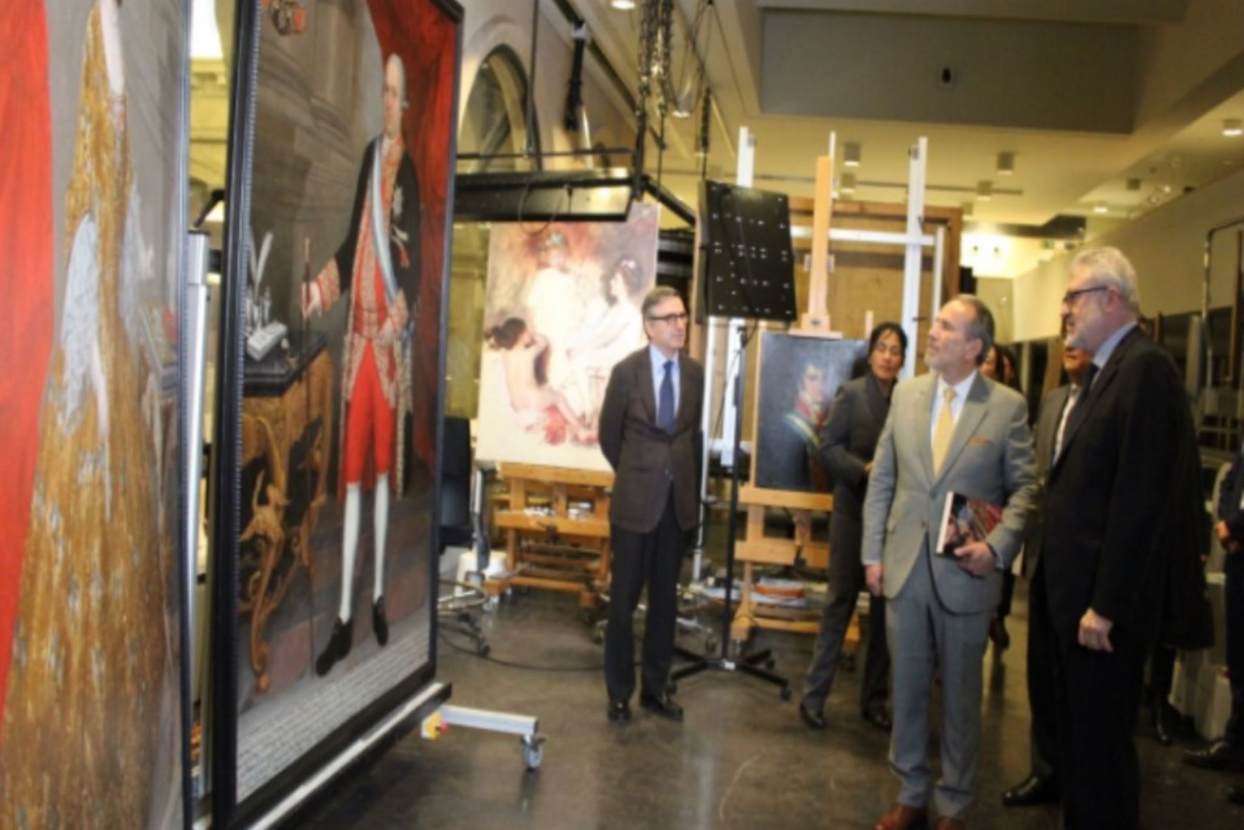 Tras la ceremonia de suscripción, el canciller Schialer, acompañado por el director Miguel Falomir y otras autoridades, visitó el Taller de Restauración del Museo, donde fueron restauradas dos pinturas limeñas del siglo XVIII. (Fuente: Andina)