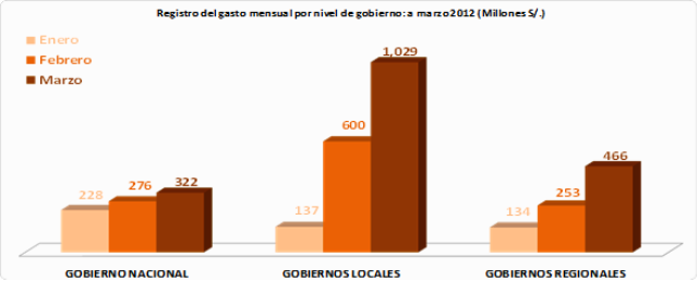 El gobierno nacional gastó en inversiones S/. 322 millones y los gobiernos regionales lo hicieron con S/. 466 millones. Cabe indicar que en el gobierno nacional destacaron los sectores de Transporte y Comunicaciones con S/. 155 millones, Educación con S/. 69 millones, Salud con S/. 29 millones y Agricultura con S/. 19 millones. Para el caso de los gobiernos regionales, sobresalieron el del Callao con S/. 54 millones, Loreto con S/. 41 millones, Arequipa con S/. 38 millones y Cajamarca con S/. 32 millones.