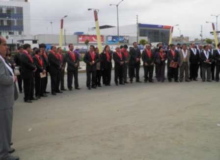 Cabe indicar que acto simbólico de protesta los jueces y fiscales participaron de un acto de izamiento del Pabellón Nacional en el frontis del palacio judicial de Chimbote.(Texto y fotos Lindberg Cruzado)