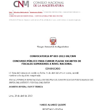El secretario general del Consejo Nacional de la Magistratura, Mario Álvarez Quispe, publicó la decisión final de los consejeros del CNM, que por mayoría (4 contra 2) votó en contra del pedido de reconsideración a la votación inicial a favor de Nancy Moreno planteado sospechosamente por el consejero Gastón Soto Vallenas.