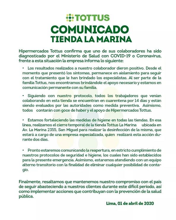 La empresa informó que cerró de manera preventiva el referido establecimiento en Lima, el cual será sometido a la desinfección integral de todos sus ambientes, en los próximos dos días, por parte de una firma especializada. Esto se hizo público a través de un comunicado.