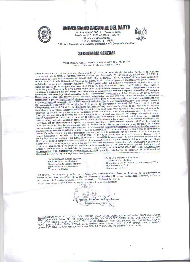 Chimbote en Línea.- Según un acuerdo de Consejo Universitario de la Universidad Nacional del Santa (UNS) las actividades académicas en este centro superior de estudios se suspenderán desde el 9 al 14 del presente mes, ante posibles desmanes durante los comicios convocados para el 11 de este mes por el grupo opositor a la gestión de la rectora América Odar Rosario.