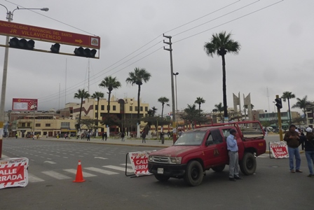 Chimbote en Línea (Locales).- Tras el anuncio del plantón de los transportistas de servicio público, la Municipalidad Provincial del Santa, no tuvo mejor idea que bloquear el acceso a la Plaza de Armas de Chimbote con la excusa de realizar el pintado de señalización de las pistas, el arreglo de jardines y trabajos de limpieza.