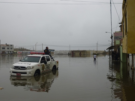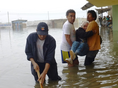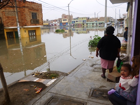 A las 10 de la mañana un grupo de trabajadores de la Municipalidad Provincial del Santa con una cisterna, trató de retirar el agua, pero no lograron su objetivo, porque el problema era mayor. En tanto los niños y ancianos que se encontraban atrapados fueron evacuados en brazos por los vecinos, ya que la policía, no arriesgaba ingresar con su unidad.