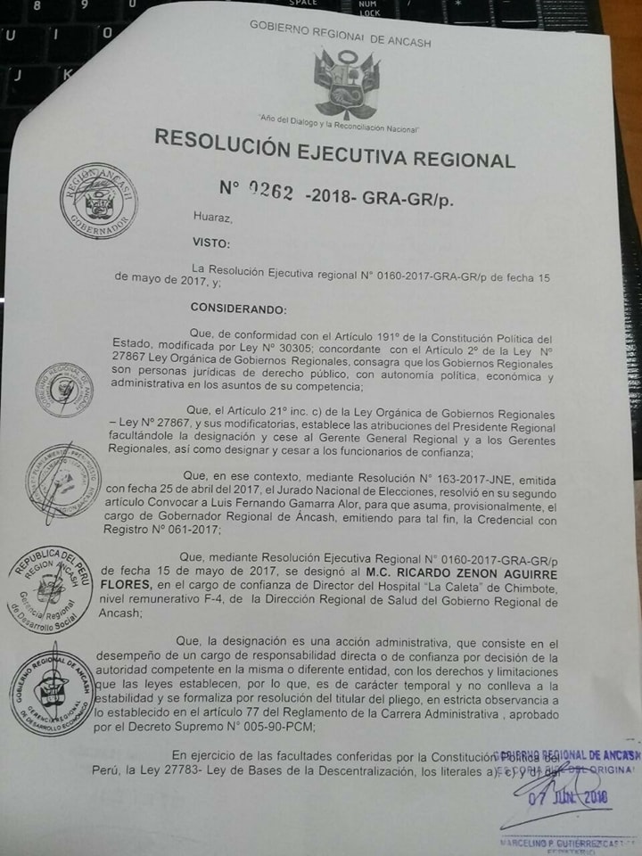 El documento lleva la firma del gobernador de Áncash y se dispone que el director saliente entregue el cargo en un plazo de 48 horas para que de inmediato asuma funciones Solórzano, quien anteriormente ya había asumido las riendas del llamado “hospital de los pobres”.