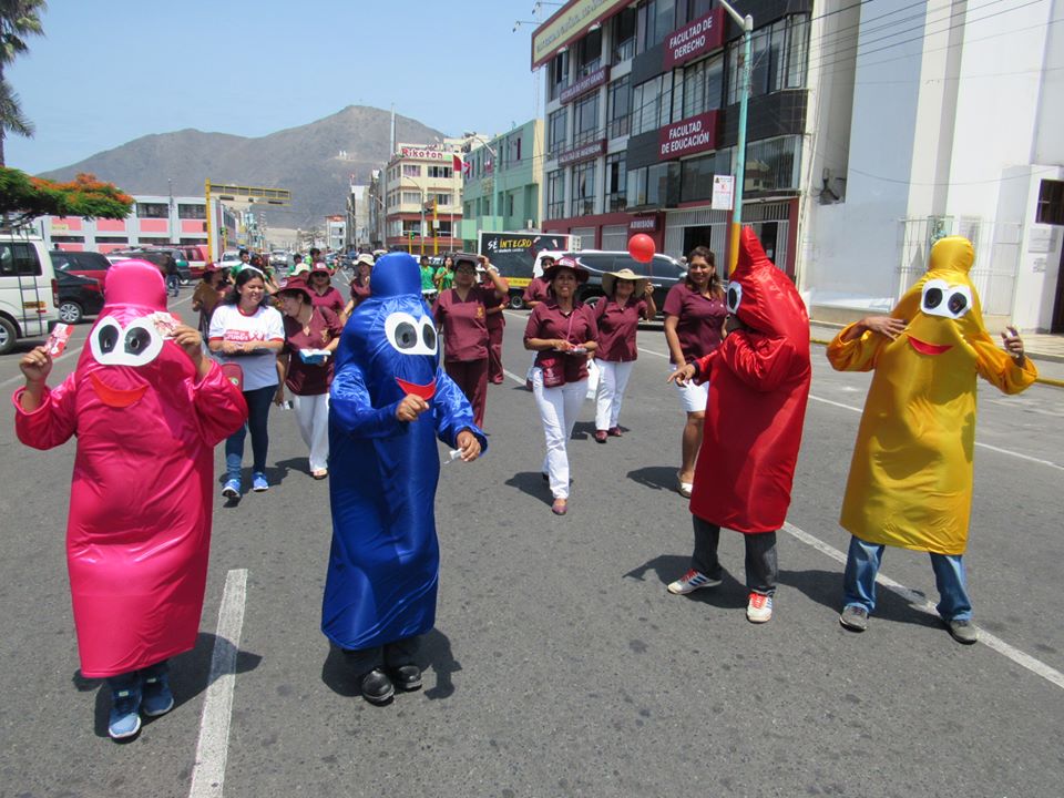 Con una colorida caravana y personajes de preservativos recorrieron por las principales calles de Chimbote y repartieron los preservativos de manera gratuita a los transeúntes.