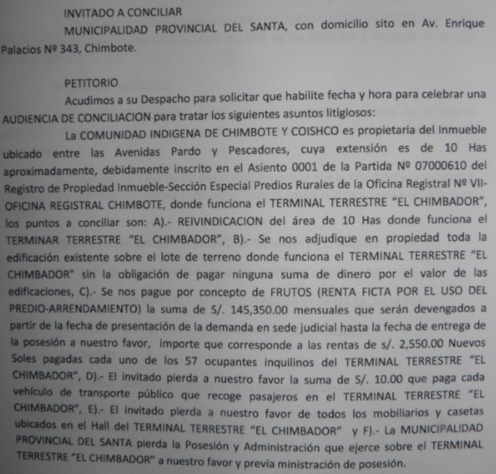 Una vez más el supuesto presidente del grupo de comuneros, Manuel Morales del Águila, ha remitido hasta en dos oportunidades documentos de invitación para conciliación donde le pide que se les reivindique las 10 hectáreas de terrenos a favor de su representada. No obstante solicita el pago de 145 mil 350 soles mensuales y de 10 nuevos soles por cada ómnibus interprovincial que recoge pasajeros en dicho establecimiento.