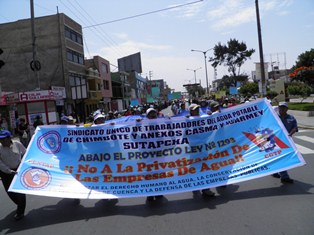 Con carteles y banderolas los manifestantes se volcaron a las calles del centro de Chimbote para reclamar al Ejecutivo que dé marcha atrás a su supuesta intensión de privatizar o concesionar las empresas del agua potable como ha ocurrido en la región Tumbes.