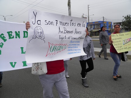 “La avenida Buenos Aires tiene un tramo oscuro, desde nuestra urbanización hasta el pueblo joven César Vallejo, a lo largo de esta vía han muerto atropelladas siete personas, además esta avenida no solo es sinónimo de muerte sino también es aprovechada por los delincuentes para asaltar a los transeúntes y a los mismos transportistas”, protestó.