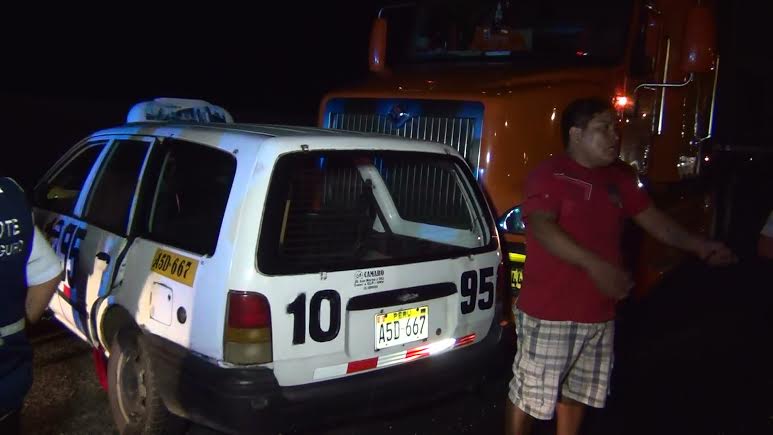 El auto, que hace servicio de taxi conducido por Antonio Adrián Baca Caballero (31, quedó empotrado en la parte delantera del tráiler de placa CGH-844 conducido por Jorge Díaz Saldaña (38). Según cuenta Díaz, fue el taxista Antonio Baca quien quiso adelantar al tráiler de manera irresponsable pero al ver que en sentido contrario se acercaba un ómnibus giró su vehículo a la derecha y terminó embestido por el pesado vehículo.