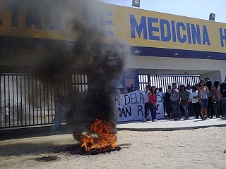 Chimbote en línea (Nuevo Chimbote).- Desde primeras horas de la mañana más de un centenar de alumnos de Medicina Humana de la Universidad San Pedro (USP) se apostaron en el frontis de la facultad, en la urbanización San Luis en Nuevo Chimbote, quemando llantas y protestando contra las elecciones de la Asamblea Universitaria, pues según dicen el rector José María Huamán Ruíz será reelecto en este proceso.