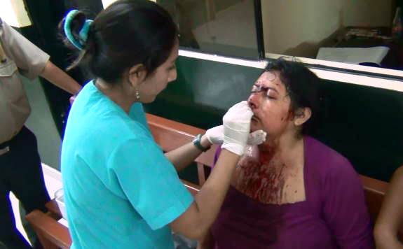 La joven madre de cuatro pequeños niños tenía el rostro cubierto de sangre y fue atendida por el personal paramédico del Serenazgo  que logró brindarle los primeros auxilios.