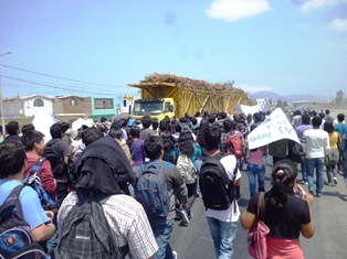 Los estudiantes provistos de banderolas tomaron el puente Lacramarca, algunos se colocaron en ambos extremos mientras que otros prefirieron sentarse sobre la vía. Ellos protestan contra el artículo 7 de la Ley 29914 que considera que el ascenso de los docentes contratados sea cancelado con los recursos directamente recaudados de la institución y por ende una de las alternativas serían el incremento de matrícula.