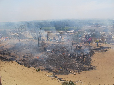 Chimbote en Línea (Locales ).- En menos de diez minutos, un pavoroso incendio dejó en escombros quince ranchos en el asentamiento humano Ampliación Primavera Alta. Las chispas de fuego de la cocina a leña de una de las moradoras provocó el siniestro.