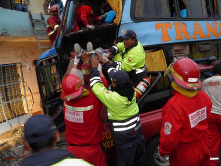 Voluntarios de la Compañía de Bomberos con apoyo de los agentes del serenazgo de Chimbote trabajaron arduamente más de dos horas y media para rescatar a los heridos que fueron llevados de emergencia al Hospital La Caleta. Tuvieron que utilizar varios equipos de oxicorte para liberar a los pasajeros.