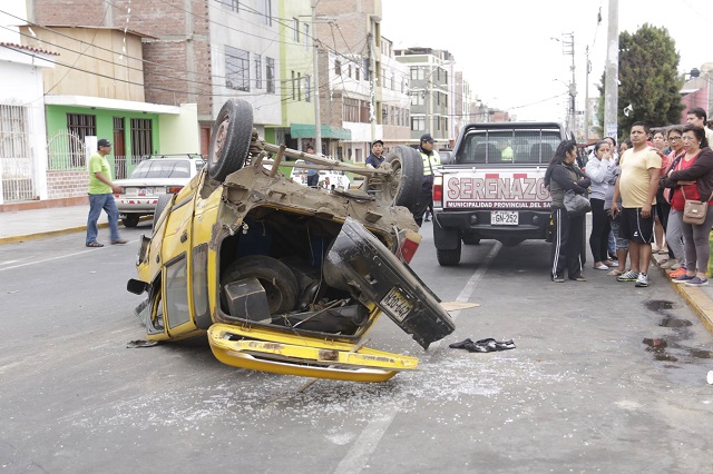 Los comerciantes del Mercado Alfonso Ugarte informaron a los policías que el taxista por evitar colisionar su automóvil Tico de placa de rodaje H10-647 contra una moto carguera realizó una maniobra temeraria y terminó volteando de campana su vehículo.