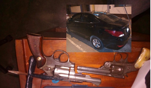 El jefe del Departamento de Investigación Criminal de Chimbote, comandante PNP Ulises Córdova Del Valle, informó que estos sujetos se desplazaban a bordo de un automóvil Hyundai modelo Accent color negro de placa de rodaje T3O-033, en cuyo interior hallaron dos revólveres calibre 38 y abastecidos con municiones, además de dos ganzúas artesanales de metal utilizadas para sus fechorías.