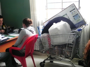 El domingo a las 8.40 de la noche compraron cuatro banquitos de plástico en Sodimac, pagaron en caja 20 soles e ingresaron por los almacenes de esta tienda de artefactos. Sin darse cuenta de que eran filmados cargaron al coche de compras un televisor Let y un blue ray, valorizados en 5 mil 266 soles.