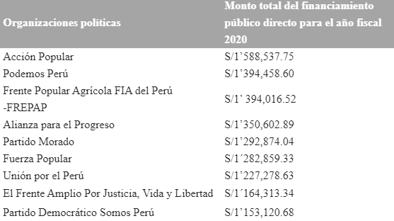 La ONPE establece asimismo que en este caso el financiamiento público directo, de periodicidad mensual, sólo será entregado durante los años 2020 y 2021, dado que el periodo del mandato del Congreso será menor, destinado a completar el periodo quinquenal legislativo 2016 y 2021.