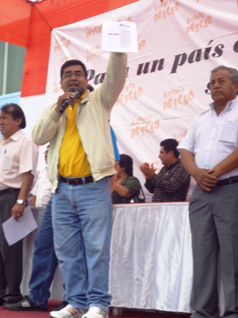 Chimbotenlínea.com (Por: Gonzalo Horna).- Luego que hace algunos días pidiera su renuncia públicamente y lo llamara “El Herodes de la pesca”, hoy el presidente regional, César Álvarez Aguilar y sus bases comandos organizaron un mitin de agradecimiento a favor del Ministro de la Producción Kurt Burneo, esto en mérito a la publicación del decreto supremo 017 que favorece a la pesca del consumo humano directo.