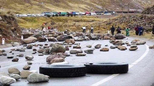 Los caminos fueron bloqueados con piedras y palos por los manifestantes lo cual impidió todo el día de ayer la circulación de los vehículos de transporte interprovincial, que trasladaban a pasajeros hacia las ciudades ubicadas a lo largo del Callejón de los Conchucos y del Callejón de Huaylas.